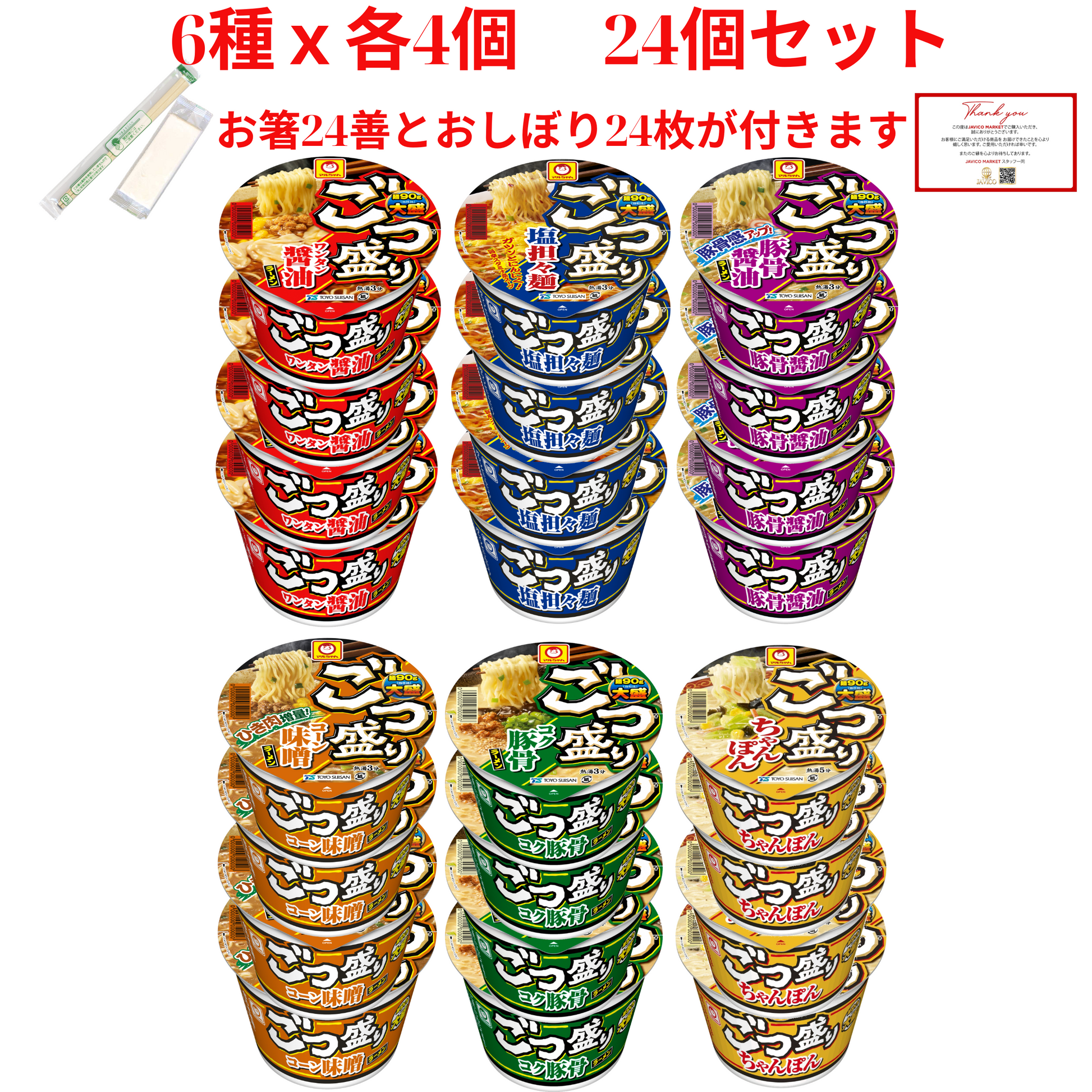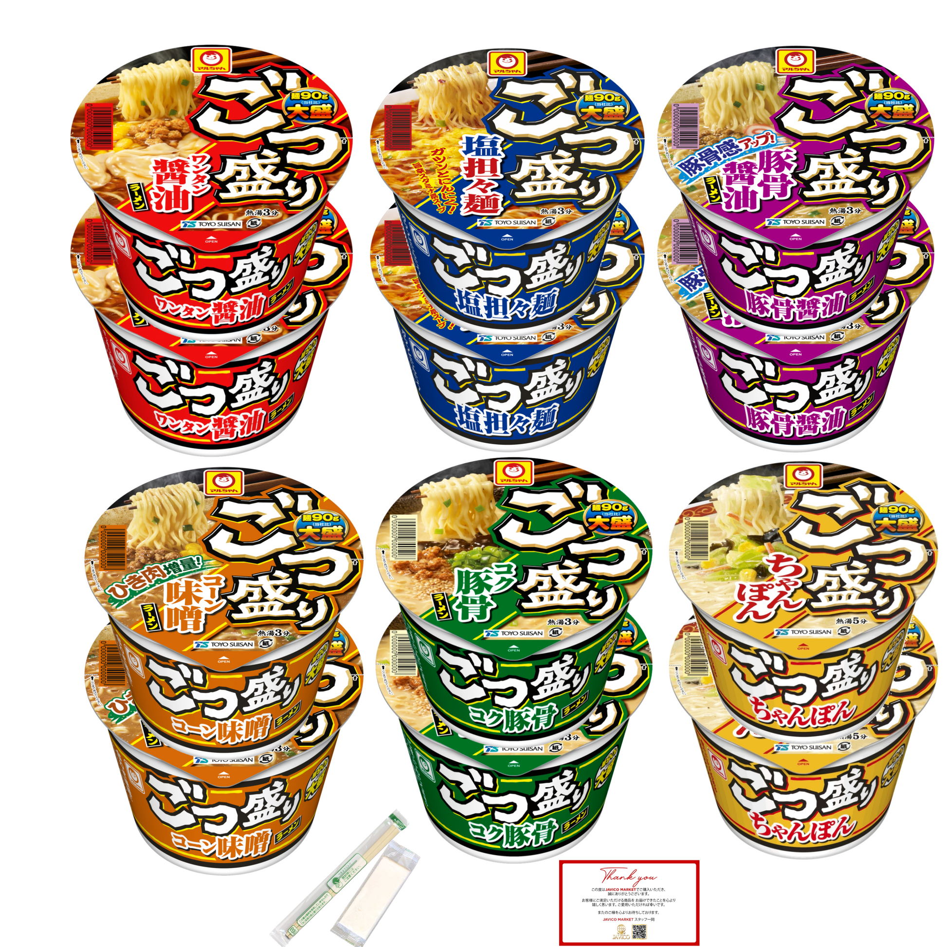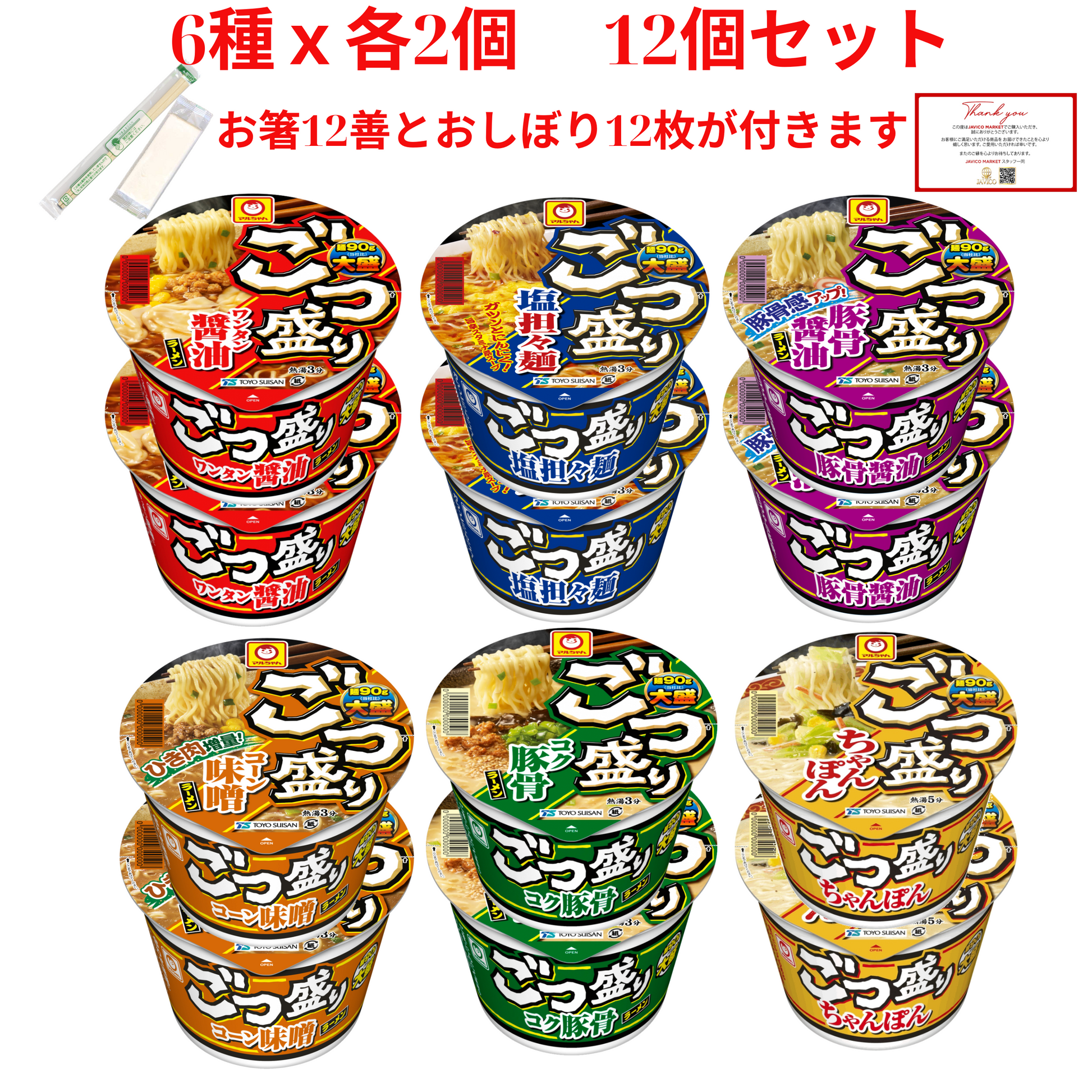 【JAVIET KAISHA】マルちゃん ごつ盛りラーメン 6種12個セット まとめ買い 食べ比べカップラーメン( ワンタン醤油ラーメン、塩担々麺、豚骨醤油ラーメン, コーン味噌ラーメン, コク豚骨ラーメン、ごつ盛り ちゃんぽん) 感謝シール、お箸とおしぼりが付け